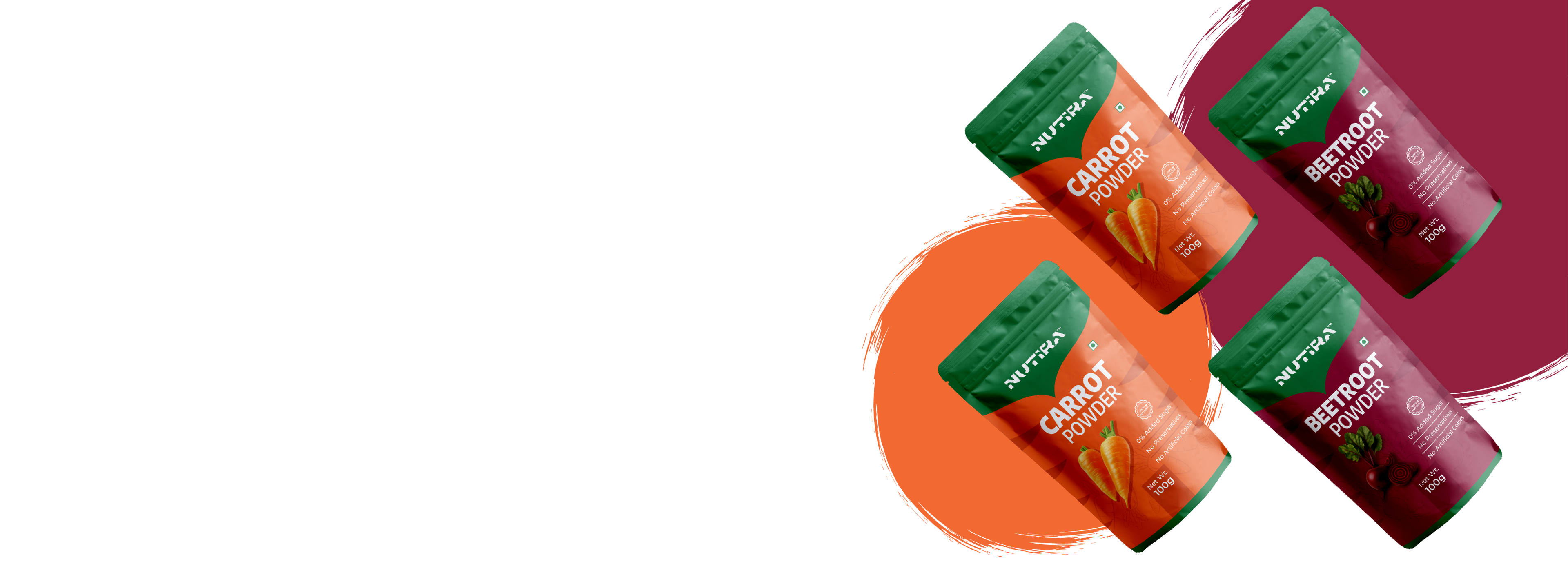 Nutira's Beetroot and Carrot Powder Combo includes 2 Pouch of each variety (100 g per Pouch). Beetroot powder supports heart health and circulation with natural antioxidants. Carrot powder provides vitamin A for eye and skin health. Both add vibrant natural colour to recipes. No added sugar, preservatives, or artificial ingredients. Mix into smoothies, baking, soups, or beverages for easy vegetable nutrition.